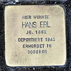 Stolpersteine für Hans und Sofie Erl wurden 2011 vor ihrem Wohnhaus in der Eschersheimer Landstraße 267 im Frankfurter Stadtteil Dornbusch verlegt.[6]