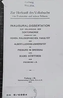 Von 1920 bis 1922 erstellte Günther im Auftrag seines völkischen[4] Verlegers Julius Friedrich Lehmann sein populäres Hauptwerk Rassenkunde des deutschen Volkes. Adolf Hitler besaß vier Ausgaben dieses Werks, die ihm von Lehmann, dreimal mit Widmungen, überreicht wurden: In der dritten Ausgabe von 1923 heißt es: „dem erfolgreichen Vorkämpfer des deutschen Rassengedanke“; die 1928er Ausgabe wurde mit einem „Weihnachtsgruss“ übersandt; und in der 14. Ausgabe von 1930 bezeichnet Lehmann Hitler als „Bahnbrecher des Rassengedankens“.[5] Diese letzte Ausgabe in Hitlers Büchersammlung, mit einem ausführlichen Anhang über europäische Juden, trägt viele Gebrauchsspuren.