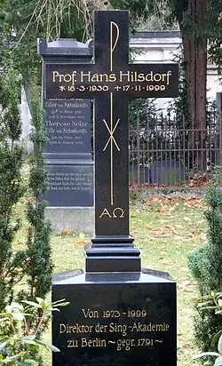Hans Hilsdorf starb 1999 im Alter von 69 Jahren in Berlin. Sein Grab befindet sich auf dem Dreifaltigkeitsfriedhof I in Berlin-Kreuzberg. Als Grabstein dient ein gesockeltes Kreuz aus schwarzem Granit.[1]