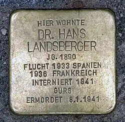 Mit Ausbruch des Zweiten Weltkriegs 1939 wurde Landsberger im Internierungslager Les Milles bei Aix en Provence interniert, Ende 1939 entlassen und nach dem deutschen Angriff auf Frankreich 1940 erneut in Les Milles gefangen gehalten. Mitte September 1940 wurde er in das Lager Camp de Gurs in Südfrankreich deportiert und starb dort zum Jahresbeginn 1941.[10] Seine zweite Ehefrau überlebte in einem Versteck in Juan-les-Pins.