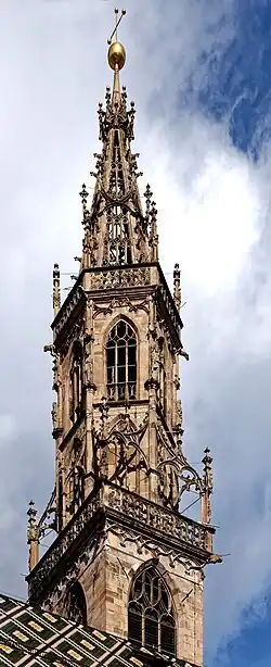 Man sagt, der stolze Turm habe viel, viel Geld gekostet, und wenn die Steinmetzen und Bildhauer ihre Geduld verloren haben und nimmer arbeiten wollten, hätten die reichen Bozner Kaufleute das Geld in Scheibtruhen herbeiführen und es ihnen vorschütten lassen, worauf jene wieder ihren Meißel ansetzten.[3]