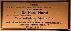 - ↑ Heinrich von Schwanewede: Hans Moral (1885-1933) – Leben, Wirken und Schicksal eines bedeutenden Vertreters der Zahnheilkunde in Die Universität Rostock in den Jahren 1933-1945 Digitalisat