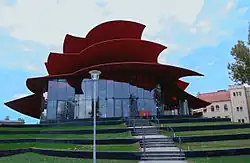 Der Architekt Paul Böhm, Sohn von Gottfried Böhm, entwarf und verwirklichte zusammen mit seinem Vater ein fünfgeschossiges Theatergebäude mit schalenförmigen, auskragenden Dächern. Beton, Glas und Stahl sind die vorherrschenden Materialien. Ein denkmalgeschützter Gasometer wurde in den Baukörper integriert. Auf der Seite des Tiefen Sees grenzt eine ebenfalls denkmalgeschützte frühere Zichorienmühle an den Theaterbau an; sie beherbergt heute ein Restaurant.