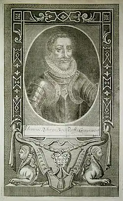 - Hans (Johannes Baptist) Rueber d. J. (1575–1634), 1584 Kammerjunge im Hofstaat des Erzherzog Matthias in Linz, zu dem auch sein späterer Schwager, der Lyriker Christoph von Schallenberg (1561–1597) als Truchsess gehörte,[77] 1594 zusammen mit Kaspar Breuner immatrikuliert in Padua, im selben Jahr in Bologna, im April 1595 in Siena; 1595 diente er als „Fähndrich“ unter Oberst Ulrich von Königsberg Freiherr von Pernstein (1547–1601) und Rittmeister Hans Freiherr von Karling in Niederungarn. Hans d. J. war (1607) mit Leonora von Schallenberg (* 1571; † zwischen 1638 und 1640)[A 16], Tochter von Wolfgang von Schallenberg zu Piberstein und Luftenberg (1533–1602) und Susanna Katharina Freiin von Eck und Hungersbach (1550–1630), verheiratet. Hans Rueber unterzeichnete 1608 den Horner Bundbrief und erhielt 1611 das böhmische Inkolat; seine Kinder: