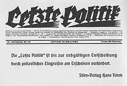 Mit Unterstützung durch Silvio Gesell gründete Hans Timm den Stirnverlag. In der Abendausgabe der Berliner Börsen-Zeitung vom 21. Juni 1926 heißt es: „In das Handelsregister, Abteilung A, ist am 17. Juni 1926 eingetragen worden: [...] Nr. 70247. Stirn-Verlag, Hans Timm, Berlin. Inhaber: Hans Timm, Kaufmann, Berlin.“[11] Noch im selben Jahr zog der Verlag nach Erfurt um. Neben Flugschriften, Broschüren und Büchern verlegte Hans Timm unter diesem Dach die monatlich erscheinende Theoriezeitschrift Die Freiwirtschaft[12] sowie das Wochenblatt Neue Zeitung der Arbeit (kurz: NZ der Arbeit)[13], die Timm in Letzte Politik umbenannte und die zum offiziellen Organ des Fysiokratischen Kampfbundes (FKB) avancierte.[14][15] Nach dem großen Erfolg, den die Nationalsozialisten bei der Reichstagswahl 1930 errungen hatten, griff die FKB-Publikation die NSDAP heftig an. Auf Gottfried Feders antisemitischen Kampfruf von der Brechung der Zinsknechtschaft entgegnete man zum Beispiel: „Der Zins hat mit dem Judentum gar nichts zu tun“. In einer Artikelserie unter der Überschrift „Kampf gegen die Nazis“ ermahnten Hans Timm und Florian Geyer 1932 die Leser der Letzten Politik: „Denkt daran, daß unter der Knute der Nazis Freiland-Freigeld einen langen Winterschlaf wird halten müssen. Deshalb müssen wir mit allen Kräften dazu beitragen, sie an der Übernahme der Staatsgewalt zu hindern.“[16] Zur Redaktion der Letzten Politik gehörten Timms Schwester Marianne und ihr Ehemann Rudi Hoell (1905–1938), der ab 1933 als Mitglied des Internationalen Sozialistischen Kampfbundes sich im Widerstand gegen das Nazi-Regime engagierte, 1938 von der GeStaPo verhaftet und anschließend in seiner Gefängniszelle tot aufgefunden wurde.[17] Die Letzte Politik erschien bis zum 10. März 1934. Auf der ersten Seite der letzten Ausgabe hieß es: „Die ‚Letzte Politik‘ ist bis zur endgültigen Entscheidung durch polizeiliches Eingreifen am Erscheinen verhindert. Stirn=Verlag Hans Timm“.[18]