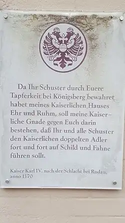 In den Zunftlegenden der Schuhmacher wird mit der Sage von Hans von Sagan die Tatsache begründet, dass ihr Zunftzeichen in Deutschland nicht ein typisches Werkzeug des Handwerks oder das Produkt als Symbol trägt, sondern angeblich aufgrund eines kaiserlichen Gnadenakts den doppelköpfigen Reichsadler.[11][12]