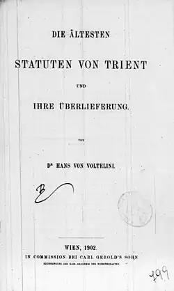 - ↑ Emanuele Curzel (Hrsg.): Hans von Voltelini. Le circoscrizioni giudiziarie del Trentino fino al 1803. Provincia autonoma di Trento – Servizio, Trient 1999, ISBN 88-86602-12-X, S. XII.