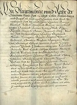 Es gibt kein Gründungsdatum der Hanse.[6] Sie ist aus kleinen, lokalen Strukturen heraus entstanden und zu einer großen Organisation angewachsen.[6] Nicht einmal die Zeitgenossen scheinen klare Vorstellungen darüber gehabt zu haben.[6] 1418 wandte sich der Rat der Hansestadt Bremen in einem Streit mit Hamburg an Köln mit der Bitte um eine Abschrift der Gründungsurkunde der Hanse.[6] Die Antwort aus Köln lautete, dass sie vergeblich nach der geforderten Schrift van der fundatacien der Duytzschen hensze gesucht hätten, aber weitersuchen und den Bremern die gewünschte Abschrift schicken würden, sobald sie fündig geworden seien.[6]