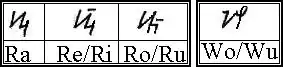 Neben den oben bereits gezeigten Zeichen für Ra, Re/Ri, Ro/Ru als auch Wo/Wu, gibt es eine alternative Schreibweise für diese Laute.