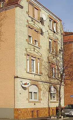 Das dreieinhalbgeschossige Gebäude in Sichtziegelmauerwerk wurde in den Jahren 1904 bis 1905 als Arbeiterwohnhaus durch Schreinermeister Ernst Nahm gemäß den Plänen des Architekten Schulz aus Heilbronn errichtet. Bemerkenswert ist die alternierende Gestaltung der Fenster. So sind abwechselnd Drillingsfenster und Zwillingsfenster an der Fassade zu sehen.