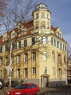 „Das dreigeschossige Haus zeigt im Aufriss geschickt gesetzte Übergänge von Wand- und Fensterflächen. Dreiecksgiebel akzentuieren die Dachflächen, ein Eckturm bildet einen ausgesprochenen „point de vue“ innerhalb des Südstadtviertels. Die ursprünglich sehr viel weiter ausladende Anlage wurde lange Zeit vernachlässigt, die Nebengebäude zum großen Teil abgebrochen; das Haus wurde in den letzten Jahren durchgreifend umgebaut.“