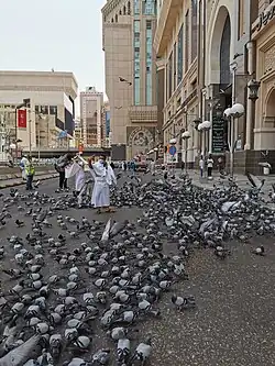 Über die Tauben des Haram waren auch einige Legenden im Umlauf. Der persische Geograph Ibn Rusta meinte, dass es zu den Besonderheiten des Haram von Mekka gehöre, dass sich keine Taube auf der Kaaba niederlasse, wenn sie nicht krank sei.[45] Auch Ibn Dschubair, der im späten 12. Jahrhundert Mekka besuchte, kennt diese Legende. Er behauptete, dass sich nie eine der Tauben des Haram auf der Kaaba niederlassen würde. Wenn eine Taube über den Haram fliege, werde sie beim Anflug auf die Kaaba nach rechts oder links abdrehen. Er berichtet auch, dass die Tauben des Haram unzählig waren und ihre Sicherheit sprichwörtlich sei.[46]