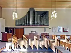 16 Register Pfeifenwerk und 5 Windladen der 1953 gefertigten „Faust“-Orgel auf elektropneumatischer Versorgung. Diese stellt den neobarocken Kern dar.