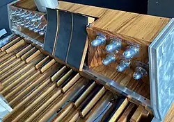 Die Marimba 8’ umfasst 49 Klangplatten ab c aus Padoukholz auf gedeckten Resonatoren.