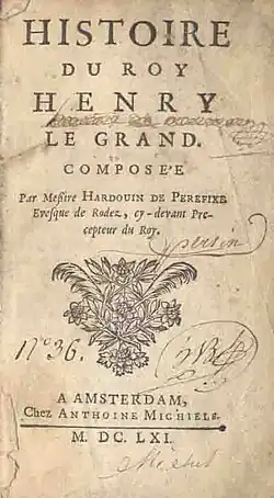 Nachdem er 1647 für den jugendlichen Königssohn lateinische Verse verfasst hatte, schrieb er für ihn eine Geschichte Heinrichs des Großen,[2] die 1661 erschien. Voltaire äußerte sich lobend zu diesem Buch, während Sainte-Beuve den Autor als charakterlosen Menschen beschrieb.[3]