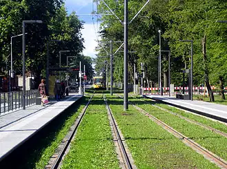 Am 3. Juni 1989 wurde die Linie A schließlich bis nach Hochstetten verlängert.[10] Die ursprünglichen Planungen hatten vorgesehen, ab Leopoldshafen zunächst wieder die alte Trasse zu verwenden, um anschließend sowohl Linkenheim als auch Hochstetten mittels einer neuen Trasse besser zu erschließen. Letztendlich wurde die neue Strecke komplett durch die Ortsmitte von Linkenheim auf der vormaligen Bundesstraße 36 gebaut, die auf eine Umgehungsstraße verlegt worden war, was bis heute immer wieder aufgrund der beengten Platzverhältnisse im Ortskern für Konflikte mit dem Individualverkehr sorgt.[10]