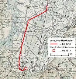 Bis 1913 zweigte die Hardtbahn im Bahnhof Mühlburger Tor von der Maxaubahn ab und folgte von dort aus in nördlicher Richtung der Erzbergerstraße durch die Karlsruher Nordstadt, die damals mitten im Hardtwald lag. Danach verlief sie noch einige Kilometer durch damals unbebautes Gebiet, auf dem sich heute die erst nach dem Zweiten Weltkrieg entstandenen Neureuter Ortsteile Heide- und Kirchfeldsiedlung befinden, um nördlich von Neureut die ebenfalls nach 1913 benutzte Trasse zu erreichen.