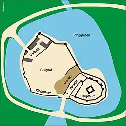 Eine Brücke über den Burggraben, die früher als Zugbrücke ausgelegt war, ermöglicht den Zugang zur Vorburg durch einen Torturm, der früher ein Fallgatter besaß. Auf dem ausgedehnten Burghof stehen heute einige Gebäude aus dem 18. und 19. Jahrhundert. Zwischen Vor- und Hauptburg liegt ein Graben, über den früher eine Brücke in den Zwinger führte.