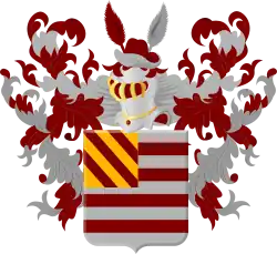 Blasonierung: Schild von Silber und Rot neunmal geteilt. Im rechten Obereck eine Vierung von Gold und Rot sechsmal schräglinks geteilt. Auf dem Helm mit rot-silbernen Helmdecken ein roter Hut mit silberner Krempe, besteckt mit rechts einem roten und links einem weißen Eselsohr.