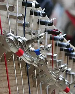 Mitte bis Ende des 18. Jahrhunderts waren „Zugkrückenmechaniken“ weit verbreitet: Dieses waren mechanisierte Haken, welche die Saiten auf einen am Hals angebrachten Steg quer zur Saitenebene drückten (Konstruktion Fa. Naderman Paris). Seltener war eine Mechanik mit mehreren drehbaren Haken (Fa. Cosineau Paris).