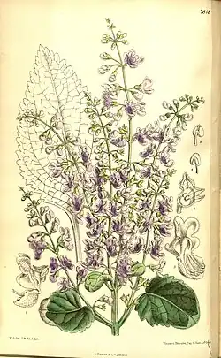 Illustration aus Curtis’s Botanical Magazine, Tafel 7818 von Plectranthus elegansElektronenmikroskopische Aufnahme von einfachen Trichomen auf einem Laubblatt der Buntnessel (Plectranthus scutellarioides)Illustration von Plectranthus parviflorus aus Nikolaus Joseph Jacquin: Fragmenta botanica, figuris coloratis illustrata, Tafel 91
