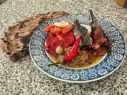 Harissa (arabisch هريسة, DMG Harīsa oder im Tunesisch-Arabischen Dialekt: L’Hrisa/L’Hrisa l’ëarbiy) ist eine aus Tunesien stammende scharfe Gewürzpaste aus frischen Chilis, Kreuzkümmel, Koriandersamen, Knoblauch, Salz und Olivenöl.[1] Heute ist Harissa in der gesamten nordafrikanischen Küche (in Marokko als Sahka) bekannt, aber auch in vorderasiatischen Ländern und Europa. Es gibt verschiedene Rezeptvarianten in den einzelnen Ländern. Obwohl tunesische Harissa oft mit Chilis produziert wird, die relativ mild sind und 40.000–50.000 auf der Scoville-Skala zählen, ist die tunesische Version die schärfste, da sie den größten Chilianteil hat.[2]