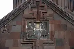 Die Bauplastik geht insgesamt auf georgische Vorbilder zurück. Ein Rundleistenpaar durchläuft auf derselben Höhe alle Außenwände und umgrenzt nach oben ausweichend Nischen und Fenster. Das gestalterische Zentrum am Ostgiebel ist ein umrahmtes quadratisches Feld, in dem die beiden Brüder Ivane und Zakare im Hochrelief auftauchen. Sie sind im Profil dargestellt und zueinandergewandt. Die Figuren tragen wie die georgischen Herrscher Stiefel, ein tailliertes Gewand und eine hohe Kopfbedeckung. Im freien Feld zwischen ihnen hielten sie ursprünglich ein Modell der Kirche, das im 19. Jahrhundert durch ein Marienbildnis aus hellem Marmor ersetzt wurde. Auf derselben Höhe links am Giebel blickt eine Sphinx in Richtung der Stiftergruppe. Das große Kreuz im Hochrelief an der Giebelspitze gehört zu den weiteren, im nördlichen Armenien für diese Zeit und für die georgischen Kirchen charakteristischen Gestaltungsformen. Am unteren Giebelabsatz dieser Seite ist das Flechtwerkornament des Giebelprofils durch eine Inschrift in armenischen Großbuchstaben ersetzt: „Herr und Gott, habe Erbarmen mit den Arbeitern. Amen.“