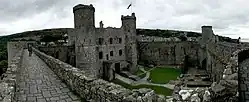 Die äußere Ringmauer besitzt eine von zwei kleinen halbrunden Türmen gesicherte Ausfallpforte an der Nordseite, ein weiterer kleiner Turm befindet sich an der Südseite. An der Südwestecke der äußeren Mauer beginnt die zum Fuß der Klippe führende Treppe mit 137 Stufen, die auf halber Höhe durch ein Tor mit Zugbrücke zusätzlich gesichert war. Um den Fuß der Klippe verläuft eine weitere, heute stark beschädigte Mauer, durch die im Mittelalter ein Tor direkt zum Meer führte.