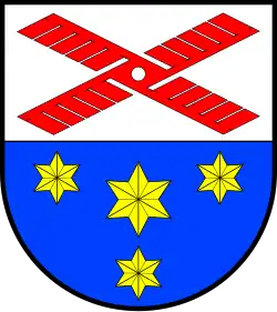 Blasonierung: „Von Silber und Blau geteilt. Oben das rote Flügelkreuz einer Windmühle, unten ein sechsstrahliger goldener Stern, begleitet von drei gleichartigen, kleineren Sternen in der Stellung 2 : 1.“[5]