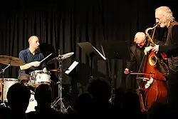 Harris Eisenstadt (links), Ken Filiano (Mitte) und Larry Ochs (rechts) mit The Fictive Five bei einem Konzert im Club W71, Weikersheim