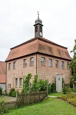 Ehemaliges Fuetterer'sches Schlösschen, später Harsdorfer Schlösschen: Zweigeschossiger Sandsteinquaderbau über quadratischem Grundriss, mit Mansarddach und Glockentürmchen, 18. Jahrhundert
