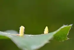 Die Gallen dieser Art sind rundliche, pustelartige, meist behaarte Gallen und etwa 3–4 mm groß. Sie befinden sich stets auf der Oberseite von Buchenblättern. Meist sind sie zahlreich in den Winkeln des Mittelnervs vom Blatt angeordnet. Die weißen Larven sitzen im Zentrum der Gallen. Sie haben einen schlanken, walzenförmigen Körper, der manchmal dicht mit bräunlichen Haaren besetzt und manchmal kahl ist, und sind etwa 4 mm lang.