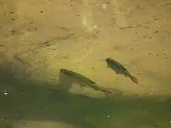 Der Fischbestand ist vorrangig durch die Angelvereine geprägt, die die Teiche pachten. Vertreten sind unter anderem Flussbarsch, Karpfen, Rotauge, Zander, Rotfeder, Regenbogenforelle und Blaunase.[13] Die u. a. im Oberteich bei Stiege nachgewiesene Groppe ist in den Teichen und zuführenden Bächen wahrscheinlich weit verbreitet und zumindest in den FFH-Gebieten dauerhaft existenzfähig, jedoch durch die geringe Individuendichte empfindlich für Störungen.[10]