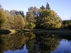Auch ökologisch wichtige Bäume wie Silber-Weide, Korb-Weide, Lavendel-Weide finden sich an den Ufern.[11][12] Die Dämme sind von ganz unterschiedlichen Pflanzen wie Wermutkraut, Blasser Schaf-Schwingel und Quendel-Sandkraut besiedelt. Die nichtsanierten Teichdämme weisen dabei eine geschlossene Krautdecke („grüner Damm“) auf, während die sanierten oftmals mit Schotter und Gesteinsgrus bedeckt sind.