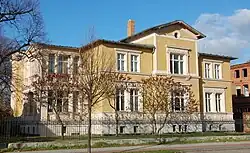 Die zweigeschossige Villa entstand in der Zeit um 1880,[1] nach anderen Angaben um 1890,[2] im Stil des Spätklassizismus. Zur Straßenseite wird das aus gelben Klinkern errichtete Gebäude durch einen mächtigen Mittelrisalit beherrscht. An der Westseite befindet sich eine Loggia, während auf der östlichen Seite ein Säulengang angefügt ist. An der Fassade findet sich figürlicher Schmuck sowie Architekturelemente die durch Putzgliederungen und Dekorationen hervorgehoben werden. Zum Anwesen gehören zwei in Lebensgröße im Stil der römischen Antike ausgeführte Skulpturen.