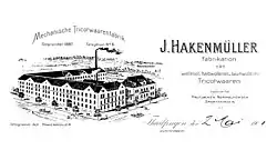 Hasana J. Hakenmüller war eine deutsche Textilfabrik, die von 1887 bis 2000 in Tailfingen und Hechingen bestand. Sie produzierte siebenstufig mit eigener Spulerei, Wirkerei, Strickerei, Bleicherei, Färberei, Ausrüstung und Verarbeitung.[4] Im Verlauf ihrer 113-jährigen Geschichte kamen von der Schaf- und Angora- über die schwere ägyptische Macco-Baumwolle, Vigogne-, Frottee- und Plüsch-, hin zur Jersey- und mit Kunststoff bzw. Nylon versetzter Wolle viele Stoffarten in die Verarbeitung.
