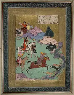 Bahrām Gūr mit Dilārām auf der Jagd. Aus einer Chamsa für ʿAbd ar-Rahīm, 1610–1617.