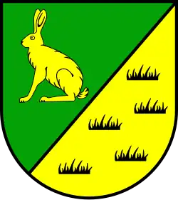 Blasonierung: „Von Grün und Gold schräglinks geteilt. Oben ein sitzender goldener Feldhase, unten fünf schwarze Grasbüschel.“[5]