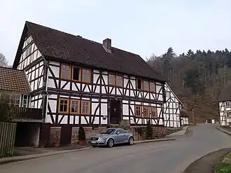• Hasselbach besitzt zahlreiche denkmalgeschützte Fachwerkhäuser, die deutliche Akzente innerhalb des Ortsbildes setzen. Das größte zusammengehörige Architekturenensemble ist der ehemalige Gutshof der Herren von Hundelshausen im nördlichen Teil des Dorfes. Es besteht aus einem Herrenhaus aus der Mitte des 16. Jahrhunderts und Wirtschaftsgebäuden, die im 19. und 20. Jahrhundert erbaut wurden. Weitere zusammenhängende Gebäudegruppen befinden sich im Bereich der Pfarrkirche, deren dicht gestaffelte Bebauung durch eine kleinmaßstäbliche Architektur geprägt wird.[11]