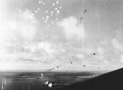 Am 25. Oktober 1944 erfolgte der amerikanische Gegenschlag und nach der 6. Angriffswelle waren die Zuikaku, die Zuiho und die Chitose von den amerikanischen Trägerflugzeugen so schwer beschädigt worden, dass sie irreparabel waren und sanken und die Zerstörer Wakatsuki and Kuwa nur noch Überlebende retten konnten.[13] Schon in der Nacht hatte Admiral Halsey die Task Force 34 gebildet. Sie bestand aus sechs Schlachtschiffen, sechs Kreuzern und achtzehn Zerstörern unter Vizeadmiral Willis A. Lee und wurde Richtung Norden auf die Reste der Flotte Admiral Ozawas angesetzt. Im Laufe des Tages wurde die Task Force 34 noch einmal geteilt und eine gemischte Gruppe aus den Kreuzerdivisionen 6 und 13 unter Konteradmiral DuBose mit zehn Zerstörern und den Kreuzern Wichita, New Orleans, Mobile und Santa Fe liefen weiter nach Norden.[14]