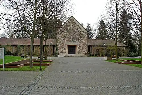 Der Haupteingang wird vom Gebäude der Trauerhalle geprägt, die aus der Nachkriegszeit stammt, dort befindet sich auch das Krematorium, das nach einer längeren Stilllegung umfangreich saniert und 2003 neu eröffnet wurde. Seit dem 28. Januar 2003 werden wieder Einäscherungen durchgeführt.