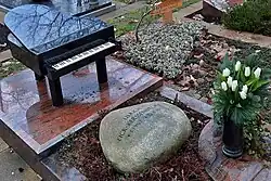 Eick-Kerssenbrock, Ulrich | Ein Flügel schmückt das Grab des Musikers Ulrich Eick-Kerssenbrock (1967–2017). Eick-Kerssenbrock studierte Klavier an der Robert Schumann Hochschule Düsseldorf und Chorleitung an der Landesmusikakademie NRW. Nach der Leitung von Chören und Orchestern im Raum Duisburg kam er 2007 nach Solingen als Leiter des Jugendsinfonieorchesters. Neben Auftritten als Solopianist leitete er dann bis zu seinem Tod in Personalunion die Musikschule Solingen und die Zentralstelle Chorgesang, ebenfalls mit Sitz in Solingen, die sich weltweit mit dem deutschsprachigen Chorgesang befasst.[13] | 51° 9′ 54″ N, 6° 56′ 38″ O | |