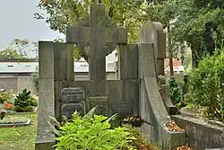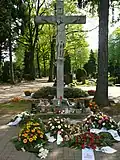 Pfarrer der katholischen Kirchengemeinde | Ein schwarzes Kreuz-Monument bildet den Mittelpunkt der Grabstätte. Dieses Monument gehörte ursprünglich zum Grab des 1917 verstorbenen Pfarrers Robert Schmitz. 1929 wurde es zum allgemeinen Kreuz für die Pfarrer umgestaltet. Alle übrigen zuvor vorhandenen Einzelgrabsteine wurden entfernt und durch einheitlich gestaltete Steinkissen ersetzt, die danach bis 2020 verstorbenen erhielten ebensolche Grabsteine.[23]