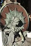 Ehrengrab des Ehrenbürgers Fritz Gressard (1839–1923) | Das Grab von Fritz Gressard schmückt eine als Bronzerelief ausgeführte Frauenfigur, auf einem steinernen Sessel sitzend. In ihrer linken Hand hält sie eine Mohnkapsel als Symbol für ewigen Schlaf. Mit ihrer rechten Hand stützt sie sich auf eine fünfsaitige Lyra. Hinter ihrem Kopf wird die als zwölfstrahliger Stern dargestellte Sonne umschlungen von einem Ouroboros, Sinnbild für den ewigen Kreislauf des Lebens. Fritz Gressard war ehemaliger Firmenchef der Seidenweberei und Tuchdruckerei Gressard & Co., als Pensionär auch erster Beigeordneter Hildens. Neben Fritz Gressard wurden hier noch beigesetzt: seine Gattin Mathilde Gressard (1851–1925); seine Tochter Else Gressard (1875–1899); deren Verlobter, der Dortmunder Arzt Johann Großbeckes (1870–1902); Frieda Krieger (1878–1958), die jüngere Tochter Gressards; und deren Gatte Friedrich Krieger (1872–1961), Eigentümer der gleichnamigen Großverzinkerei in Hilden.[9] | 51° 9′ 56,7″ N, 6° 56′ 23,7″ O | 39/08 |