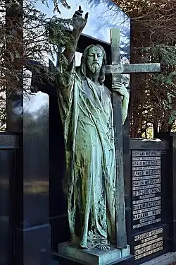 Familiengrab der Familie Wiederhold, darunter die Ehrenbürger Walter Wiederhold (1885–1959) u. Ellen Wiederhold (1921–1995) | Das Grabmal der Familie ist das mit Abstand größte Grabmonument des Friedhofs. Eine überlebensgroße in Bronze gegossene Christusfigur mit Kreuz vor schwarzem Marmorhintergund beherrscht die Szene. Die Unternehmerfamilie betrieb die Hermann Wiederhold Lackfabriken an der Düsseldorfer Straße. Ellen Wiederhold war von 1969 bis 1994 Bürgermeisterin der Stadt Hilden.[7] | 51° 9′ 54,5″ N, 6° 56′ 22,7″ O | 39/07 |