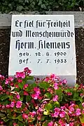 Klemens, Hermann (12. August 1900 – 7. Juli 1933) | Der Kommunist Hermann Klemens war das erste Opfer der Nationalsozialisten in Hilden.[2] Am 18. März 2006 verlegte der Künstler Gunter Demnig zur Erinnerung an Hermann Klemens einen Stolperstein an dessen letzter Wohnadresse in Hilden. | 51° 9′ 55″ N, 6° 56′ 32,5″ O | |