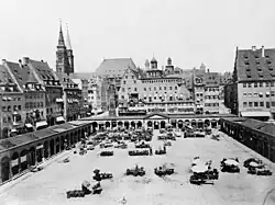 Beim Hochwasser der Pegnitz von 1909 wurde auch der Hauptmarkt überflutet.[3] Gegen Ende der Weimarer Republik und in der frühen Zeit des Nationalsozialismus wurde der Hauptmarkt zum zentralen Ort der Reichsparteitage der NSDAP und für Aufmärsche genutzt. Am 25. März 1933 erfolgte die Umbenennung in „Adolf-Hitler-Platz“.[4]