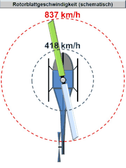 wobei d für den Durchmesser des Rotorkreises in Metern und die Konstante 0,06 für den Umrechnungsfaktor in km/h steht. Z.B. ergibt sich für den Sikorsky S-65 eine Rotorblattgeschwindigkeit an der Blattspitze (Rotorkreisradius = 12 Meter, Rotornormaldrehzahl = 185 Umdrehungen pro Minute) von 836,92 km/h. Im Vorwärtsflug muss die Geschwindigkeit des Hubschraubers zur Rotorblattgeschwindigkeit hinzugerechnet werden. Aufgrund aerodynamischer Gegebenheiten wird der Hubschrauber unsteuerbar, wenn sich die Geschwindigkeit der Rotorblattspitzen der Schallgeschwindigkeit (ca. 1235 km/h) nähert. Es ergibt sich ohne Berücksichtigung atmosphärischer Luftströmungen (Wind) eine theoretische Höchstgeschwindigkeit des Sikorsky S-65 von ca. 390 km/h (tatsächlich 295 km/h).