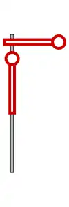 | Halt | ein rotes Licht 2. von oben | ein rotes Licht oben | Ein rückstrahlender Signalarm zeigt waagrecht nach rechts |