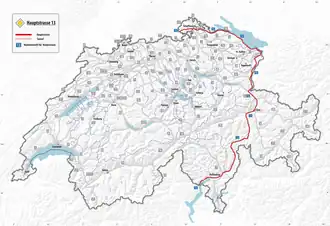 Zwischen Arbon und Bellinzona wird sie von einer Autobahn oder Autostrasse als Hauptverkehrsachse ergänzt. Deren Strecke (über die höherwertige Strasse) führt zwischen Arbon und der Verzweigung Meggenhus über die A23 (früher A1.1), danach bis St. Margrethen über die A1. Ab da verläuft ihr Trassee über die A13.